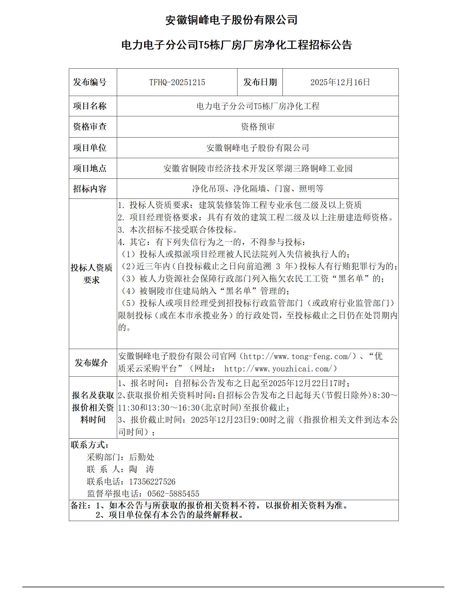 01安徽銅峰電子股份有限公司 (電力電子分公司T5棟廠房凈化工程 招標公告)_01