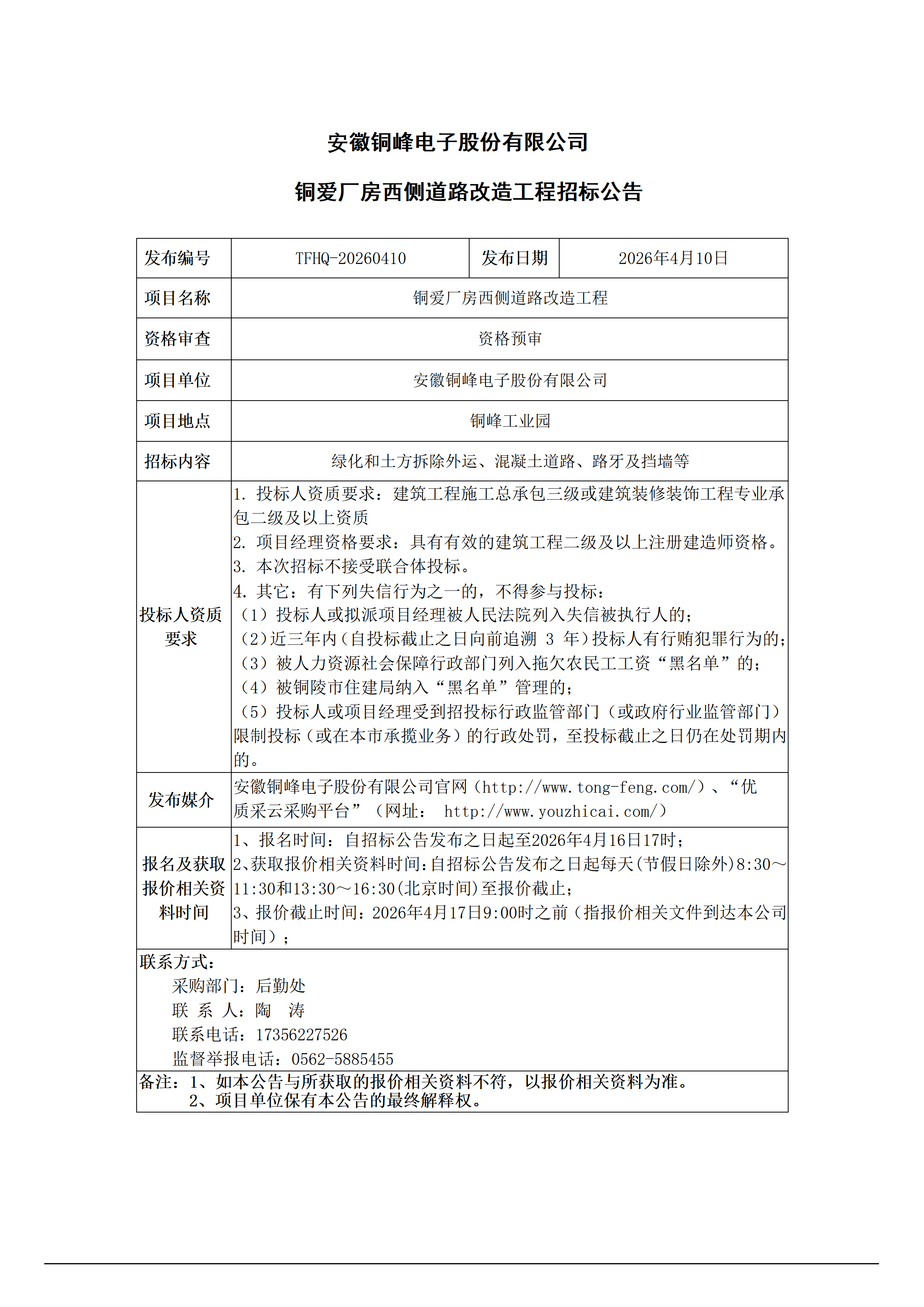 01-安徽銅峰電子股份有限公司 (銅愛廠房西側(cè)道路改造-- 招標公告)_01