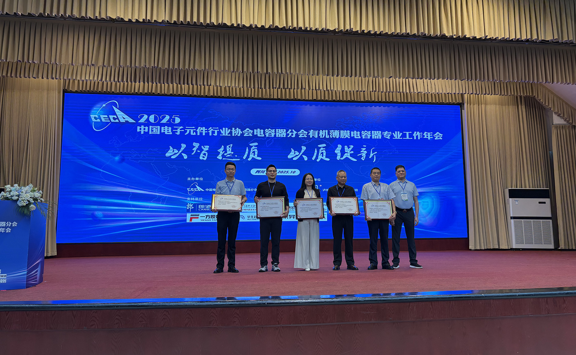 10月14日至17日,中國電子元件行業(yè)協(xié)會(huì)電容器分會(huì)有機(jī)專業(yè)2025年工作年會(huì)在四川瀘州成功舉辦。中電元協(xié)常務(wù)理事、電容器分會(huì)第九屆副理事長、公司總經(jīng)理鮑俊華代表公司出席并作主題交流報(bào)告。薄膜分公司獲評(píng)電容器分會(huì)2025年度“優(yōu)秀供應(yīng)商”榮譽(yù)稱號(hào)。