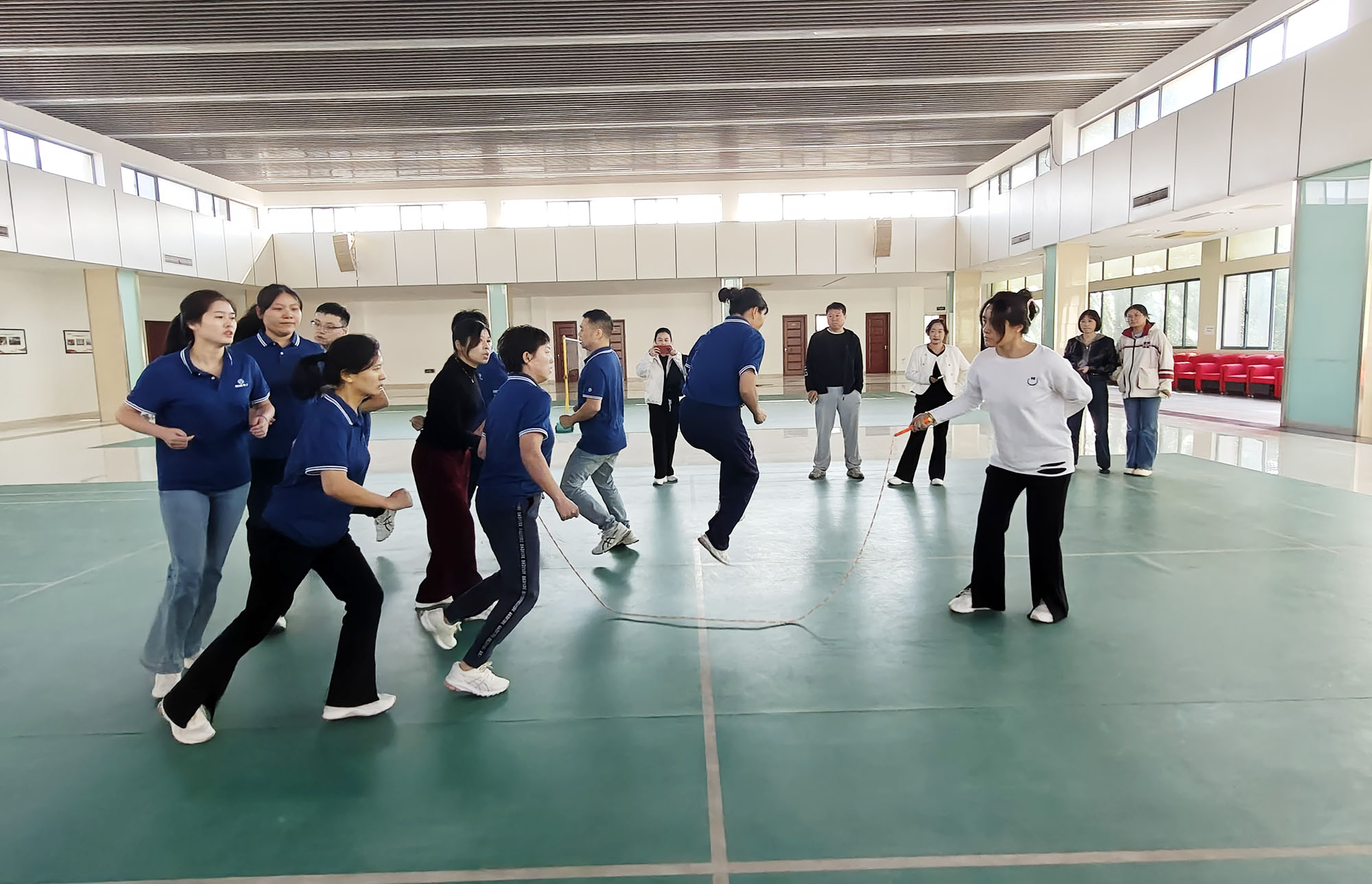 十人八字跳繩是一項(xiàng)極具挑戰(zhàn)性的集體協(xié)作項(xiàng)目,搖繩的隊(duì)員雙臂有力擺動(dòng),精準(zhǔn)掌控節(jié)奏;跳繩隊(duì)員則如靈動(dòng)的燕子,在繩間穿梭自如,形成一道道優(yōu)美的弧線。