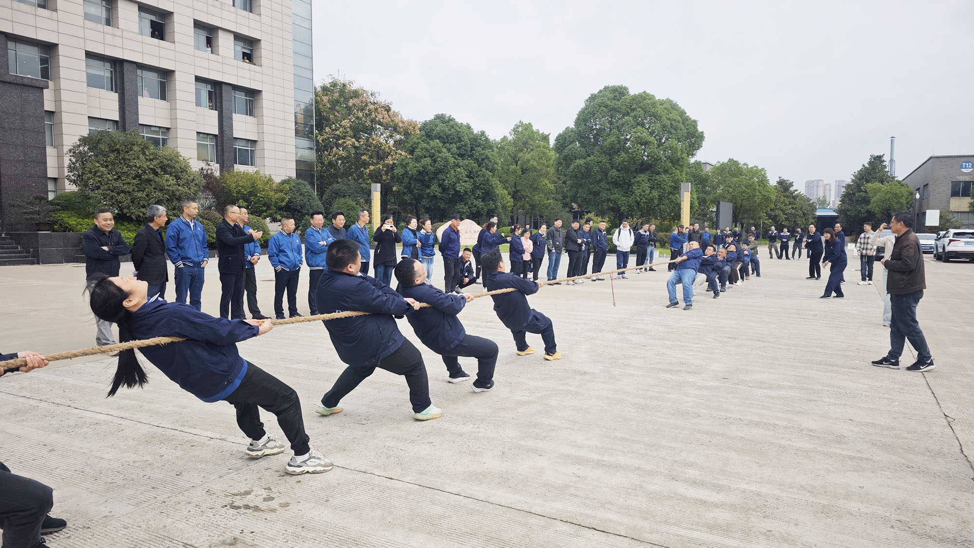 在拔河項(xiàng)目中,隊(duì)員們將彼此的力量與長繩融為一體,身體后傾成整齊的斜線,雙腳如釘般扎根地面,將團(tuán)隊(duì)的合力凝聚在手中的繩索之上。
